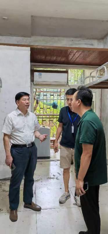 7月31日上午,学校纪委书记、省监委驻校监察专员杨鑫铨率队到施工现场,监督检查学生宿舍改造情况。