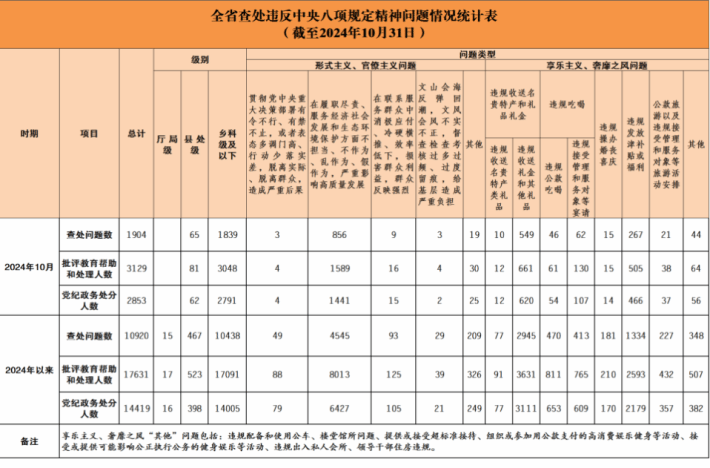 湖南省纪委监委深入贯彻中央纪委国家监委工作部署,在全省各地各部门各单位建立了落实中央八项规定精神情况月报制度。2024年以来,截至10月31日,全省查处违反中央八项规定精神问题情况如下: