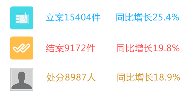 今年以来,全省各级纪检监察机关坚持“稳中求进”的基本工作方针,“老虎苍蝇”一起打,受贿行贿一起查,强化日常监督,综合运用“四种形态”,深化标本兼治。1-6月,全省各级纪检监察机关共立案15404件、结案9172件、处分8987人,同比分别增长25.4%、19.8%、18.9%。其中,查处乡科级以上“一把手”441人,立案审查调查省管干部23人,处级干部390人。